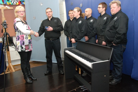 | Minna Lähteenmäki otti lahjoituksen vastaan. Peltipuuseppiä edustivat Esko Iso-Oja, Juha Wiljakka, Tero Heinämäki, Petri Riihimäki, Juho Kauppila ja Timo Tuomisto. |